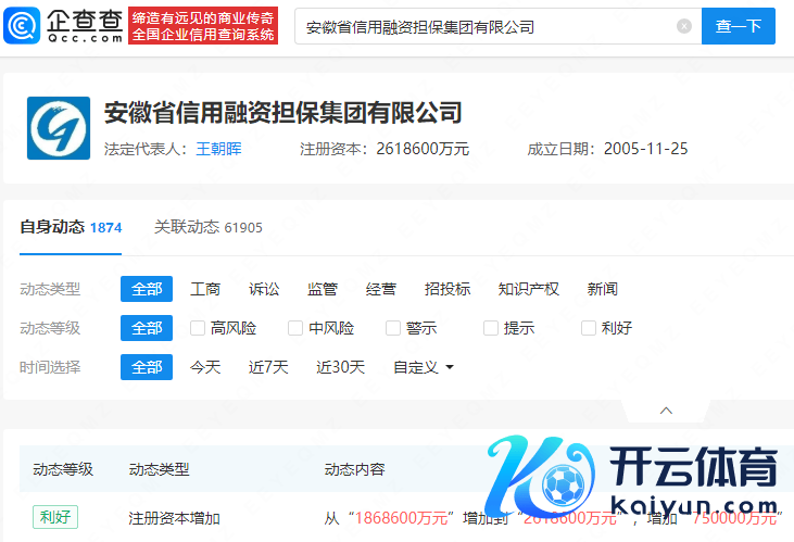 企查查APP披露,近日,安徽省信用融资担保集团有限公司发生工商变更,注册成本由186.86亿东说念主民币加多至261.86亿东说念主民币。